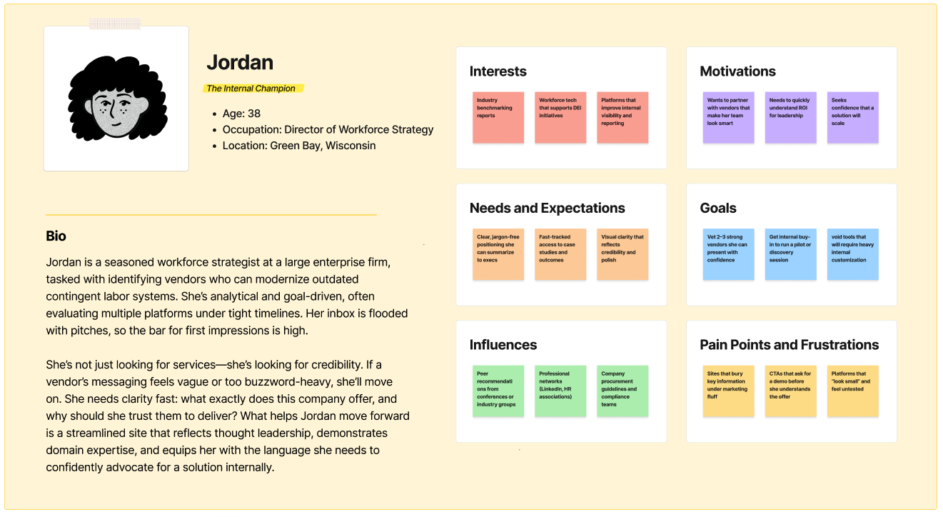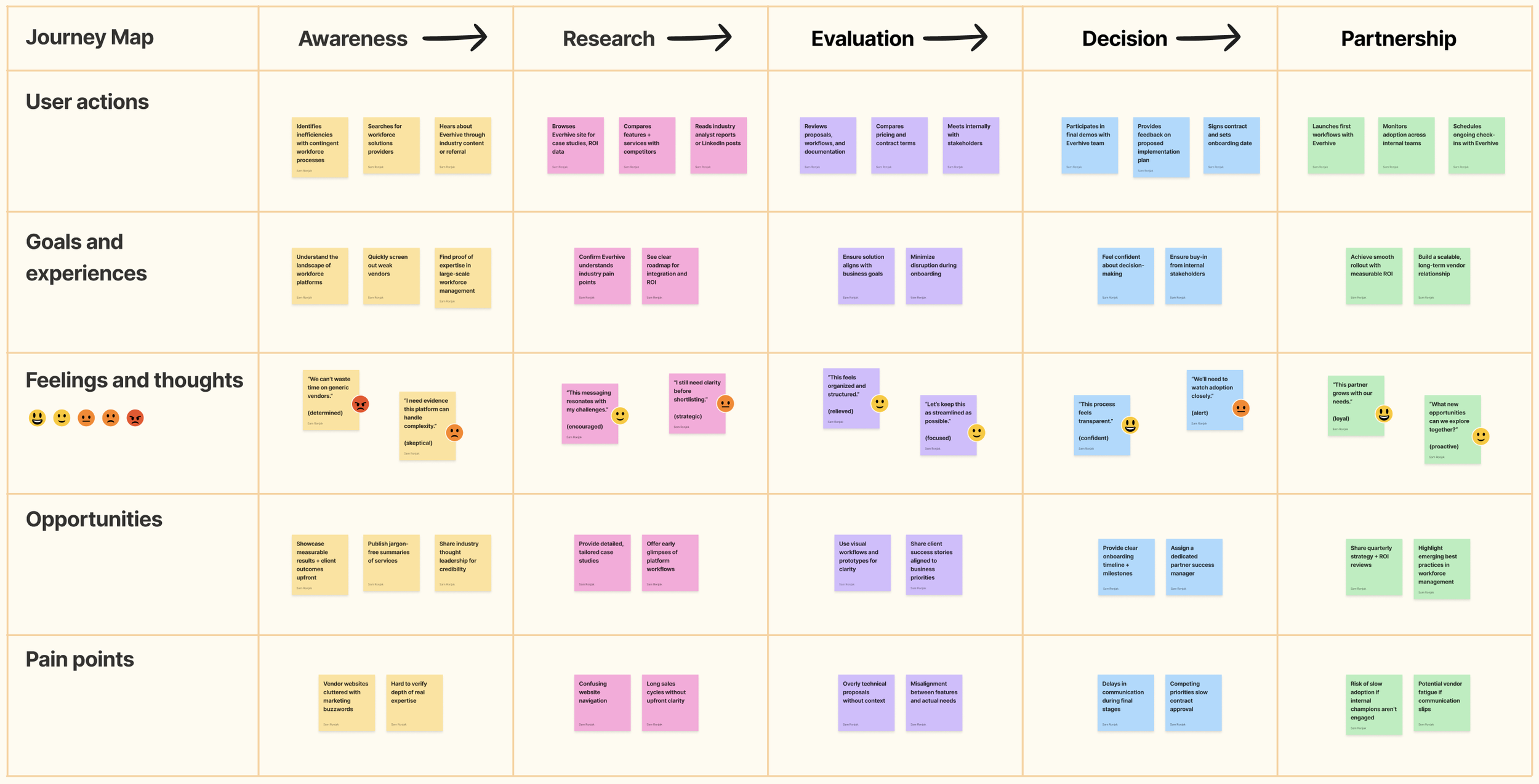 I started with a competitive audit and stakeholder interviews to understand how Everhive was presenting itself versus how enterprise clients perceived workforce management partners. This revealed a disconnect: while Everhive offered a hybrid model with clear advantages, their site didn’t articulate those differentiators in a way that resonated with decision-makers.