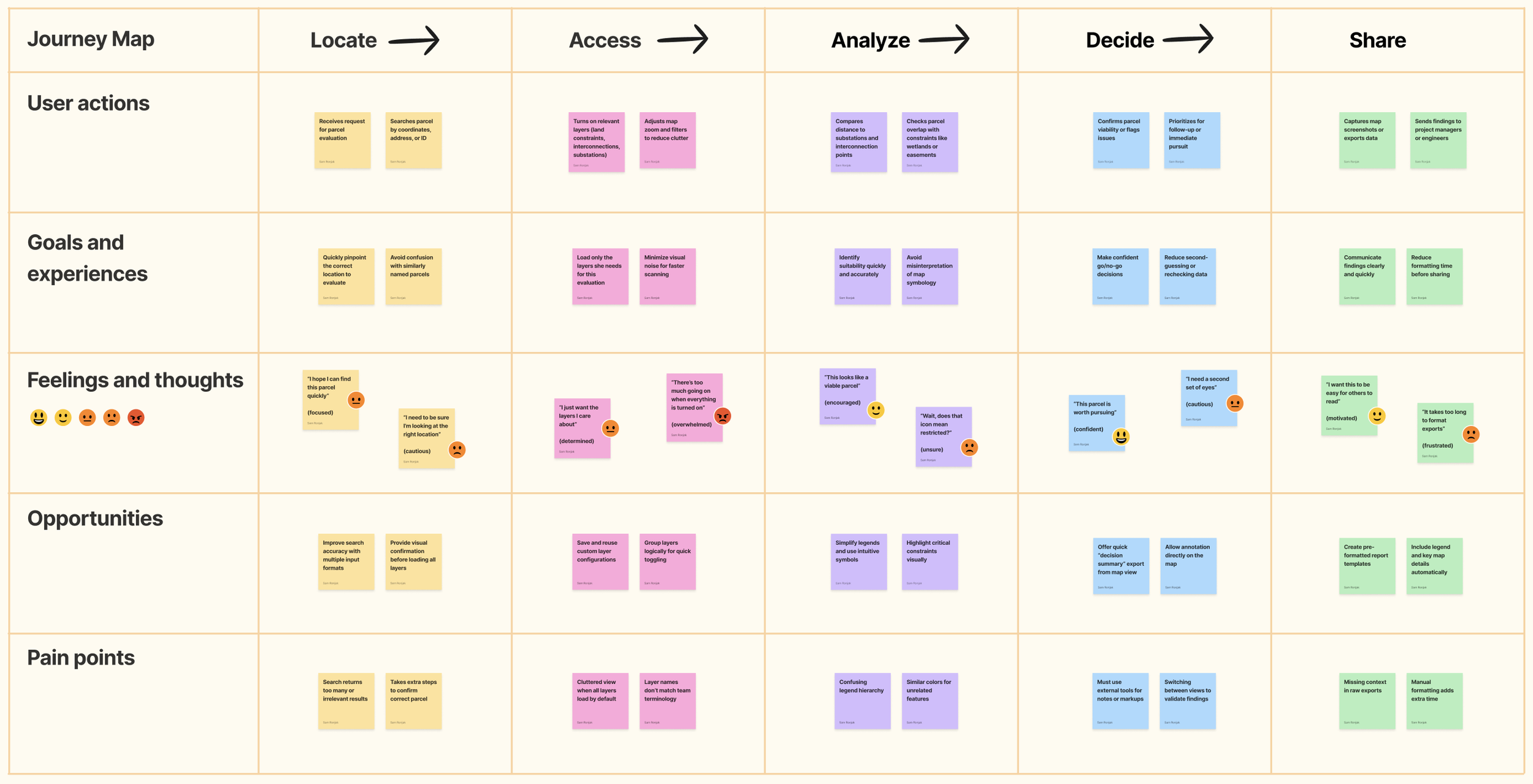 Not every detail on a map was equally relevant. Developers prioritized buildable land, proximity to substations, and grid constraints, while secondary details could be layered in as needed. I created user journey maps and personas to clarify how developers moved from “initial scan” to “detailed vetting.” This work ensured our redesign elevated the most critical layers and metrics, while supporting deeper dives without overwhelming the first glance.